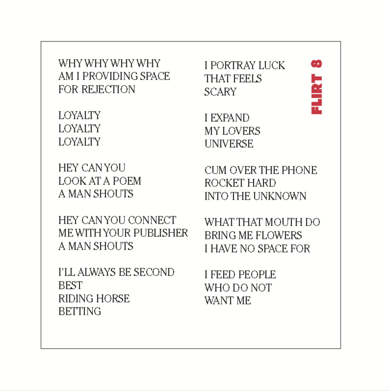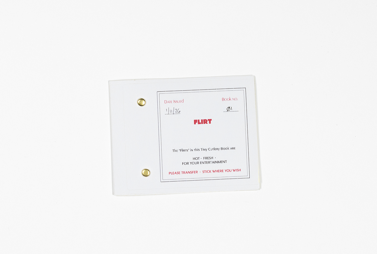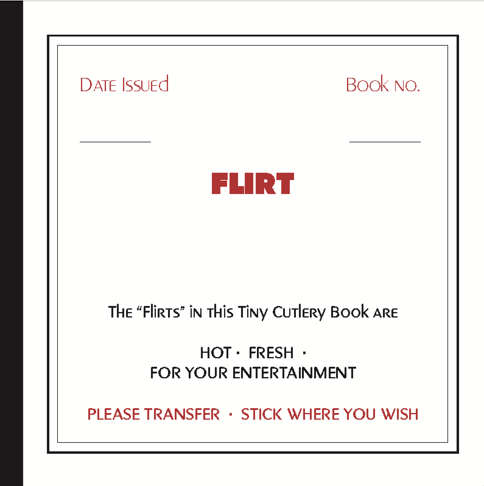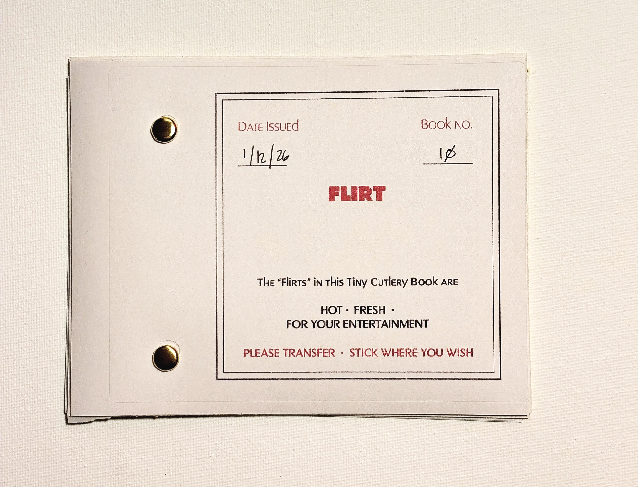 FLIRT by Sarah Osit is a limited-edition handmade book object. Inspired by vintage coupon books made by ice vendors, this collection of poems is printed not on paper, but on stickers. Meant to paste and plaster your favorite surfaces.